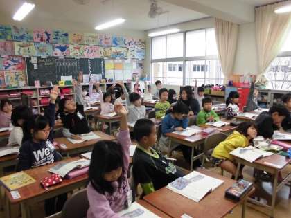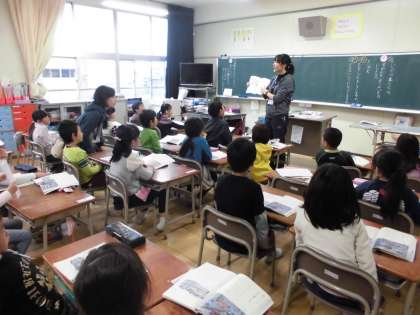 1年生の国語の授業の様子です。児童たちは、バスやじょうよう車の仕事とつくり・トラックの仕事とつくり・クレーン車の仕事とつくりについて、各自で図鑑をつくりました。本時はその図鑑を、より良いものにしていこうというめあてで、さらに内容を深めていく学習を行いました。