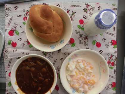 ハヤシシチュー フルーツヨーグルト リンゴパン 牛乳