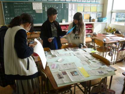総合的な学習では、新聞切り抜き作品作りを進めています。新聞記事をじっくり読み、自分たちのテーマに合う記事を切り抜いていきます。子どもたちは、生き生きとした表情で取り組んでおり、アクティブラーニングの学習として未来に生きて働く力となると感じました。