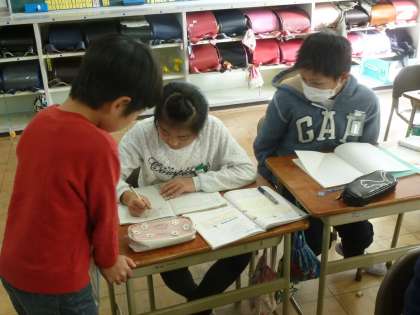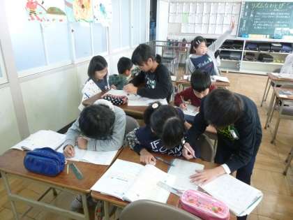 学習したことがらがいちばん定着する方法は、「人に教えること」と言われています。座った姿勢で、話を聞くだけと比べて、その定着の度合いは相当大きな差があります。4年生では、互いに教え合うことで、本当に理解できたかを確かめるとともに、子どもに教えてもらうことで、理解がより一層深まるとの考えで「教え合い」を取り入れています。