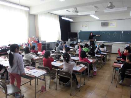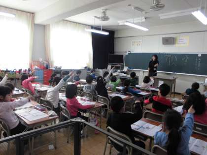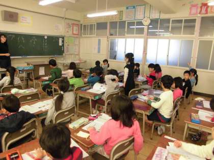 かたかなの「ウ」と「ホ」を学習を行いました。書き順やはらいの方向をみんなで意見を出し合い確認し合いました。空中に右手で練習した後、ノートに丁寧に書くことができました。