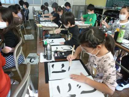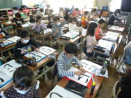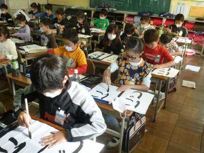 書写の時間に「にじ」という字の練習をしました。ひらがなは、漢字と違って曲線の部分が多く、バランスをとるのが難しいとされています。「とめ」や「はらい」などにも気をつけさせて、のびのびと書かせました。