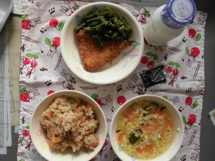 あじフライ  かきたま汁 五目御飯 いんげんのごまあえ 牛乳