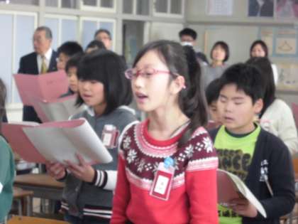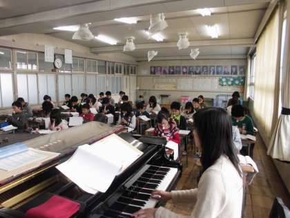 音楽室からソプラノリコーダーの美しい音色が響いています。「テルーの唄」を演奏しました。フレーズを感じ取りながら、曲の流れを大切にして演奏することができました。「生命が羽ばたくとき」の2部合唱も行いました。低音と高音に分かれ、心を込めて歌いました。学校運営協議会の委員の皆様にも聞いていただきました。