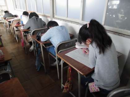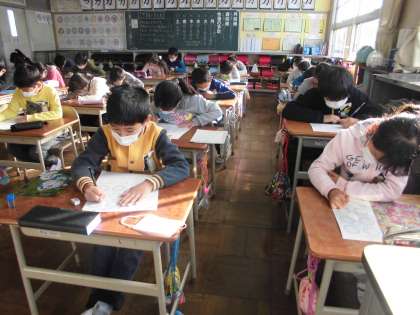 3年生の向山タイムの様子です。算数では、重さの普遍単位「g」や「kg」について理解させ、はかりを使っての測定1gの理解やはかりの使い方について学習してきました。今日は、まとめテストを行い、自分の力をためしました。