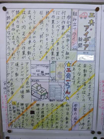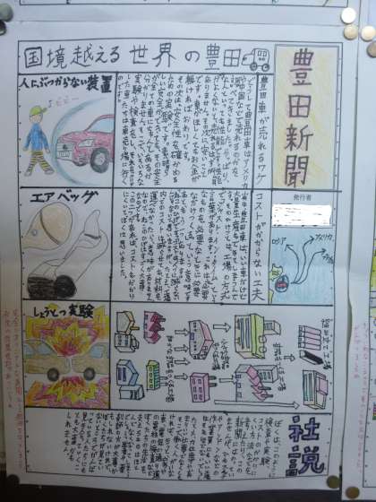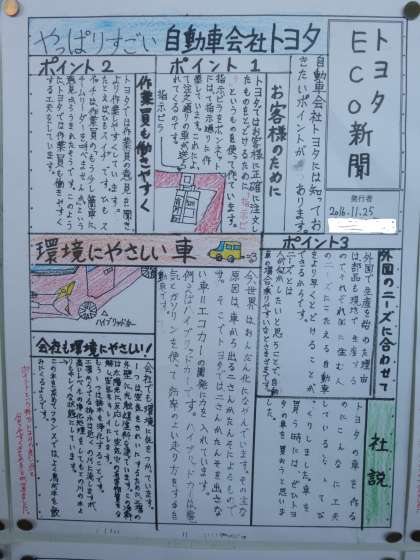 自動車生産の仕組みについての学習のまとめを新聞ふうに整理しました。効率的な生産のために工場が工夫していることや、環境や使う人のことを考えた車づくりをしていることなどをまとめました。