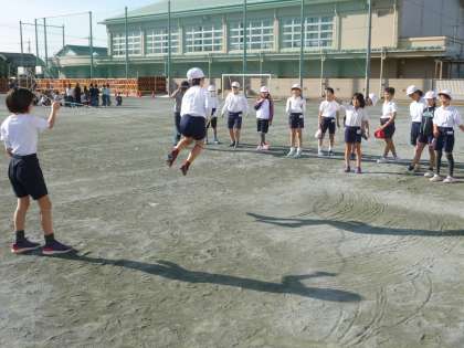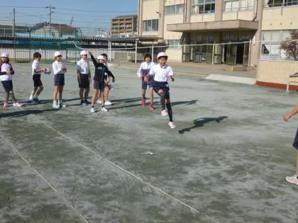 体育では、リズム縄跳びの後は、2つのグループで「連続8の字跳び」の練習をしました。苦手な子が少しでも安心して跳べるよう、回し方や入るタイミングを教え合いながらの練習でした。クラスの団結が高まる長縄跳びです。