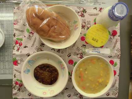 コーンスープ ハンバーグのレモンソース こめこパン かぼちゃプリン 牛乳