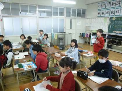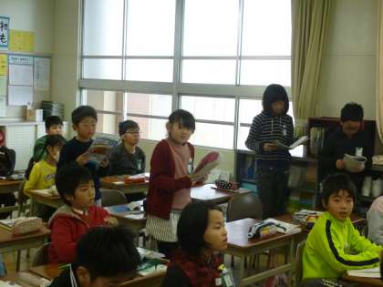 「のはらうた」の学習で作った詩の発表会をしました。一人一人の発表をよく聞いて、「よいところ」をノートに書きました。今日は、もう一度その詩と絵を見ながら、ノートに書いたよいところを発表しました。
