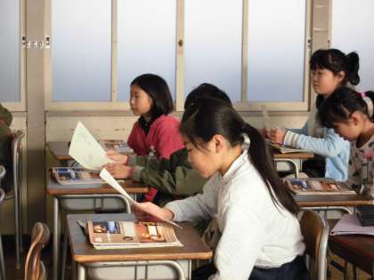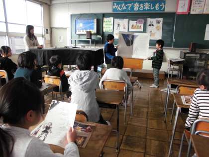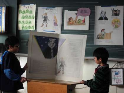 音楽室はシーンの静まり返り、児童たちが拡大絵本を真剣な表情で見ていました。歌劇「魔笛」のアリア「パパパ」を鑑賞するために、物語のあらすじを学習するための学習です。ドイツ語で歌われる曲ですが、この授業を通し内容を理解して音楽を聴けば、より学習の理解が深まります。