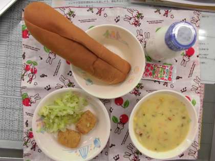 コーンクリームスープ チキンサンド ケチャップ 蒸しキャベツ 牛乳