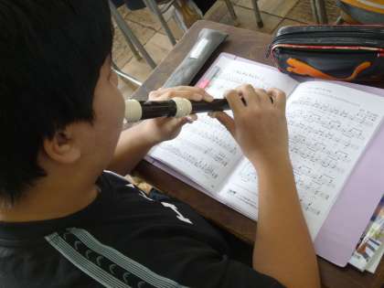 音楽では、リコーダーで「チムチムチェリー」の練習をしています。高い音がきれいに出るよう、指の押さえを確認しながら練習させました。