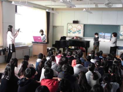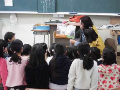 本日の向山タイムに、りぼんのみなさまによる読み聞かせを行っていただきました。それぞれの学年に合った本を読んでいただき、子どもたちは、とても楽しそうに聞いていました。また、ピアノやキーボードを使って、読み聞かせと音楽を組み合わせて聞かせてくださる読み聞かせもあり、子どもたちは、本の世界にしっかりと入っていきました。