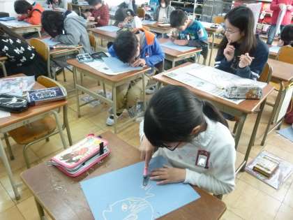 図工では、版画の制作を行っています。この一年間を振り返って、心に残った思い出を題材としています。キャンプや運動会、ミニバスケットボール部の活動など、様々な場面が描かれていました。