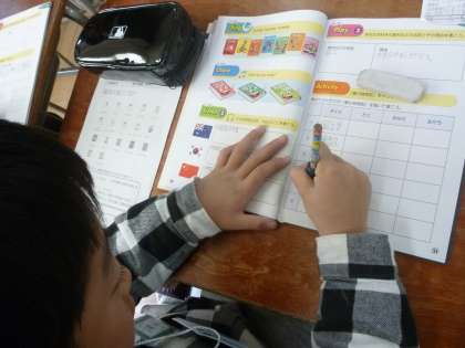 英語活動では、各教科の呼び方や「私は、〜を勉強します」ということを英語で言う練習をしました。