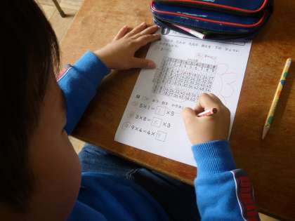 算数では、九九のまとめをプリントを使って行いました。「かける数」と「かけられる数」を表にしたものに答えを書き込ませました。九九の規則性に気づかせ、より定着を図るよう進めています。