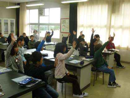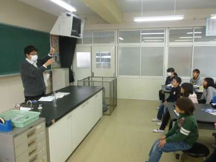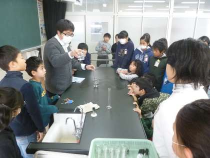 水溶液を混ぜ方についての説明をしました。水溶液を混ぜる時は、薬品が飛び散らないようにガラス棒を使って入れるよう話しました。また、作業は、一人で行うことも、薬品をこぼさないうえで大切だと理解させました。