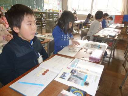 算数では、お金の計算について学習を進めています。算数セットのお金を使って、式を作ったり、計算したりしました。