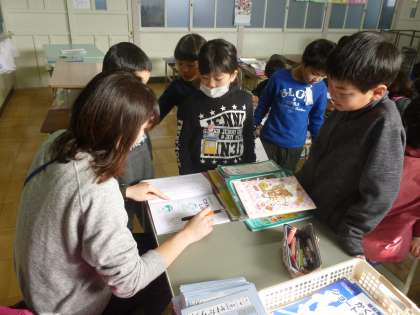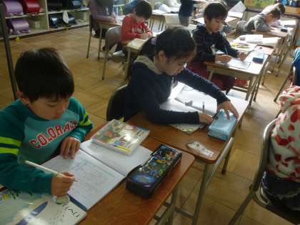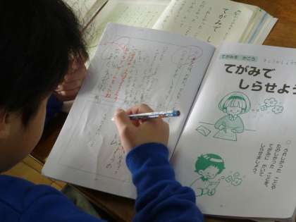 副読本を使って手紙の文章を書く練習をさせました。あげる人や自分の名前を書く位置や、内容について一人一人に指導しました。