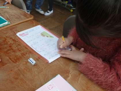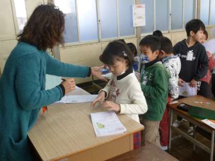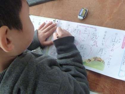 漢字ドリルを使って漢字の練習をしました。一人一人のドリルを点検し、間違っていた漢字は、もう一度書き直すよう指導しました。どの子も一生懸命に取り組んでいました。