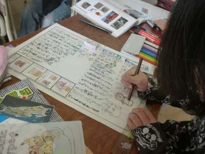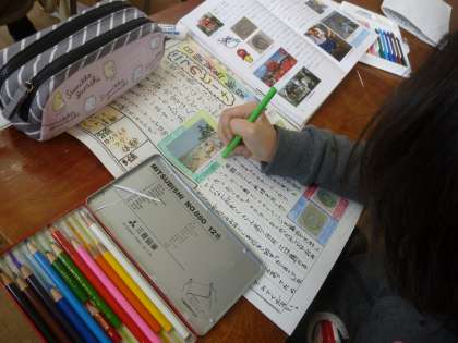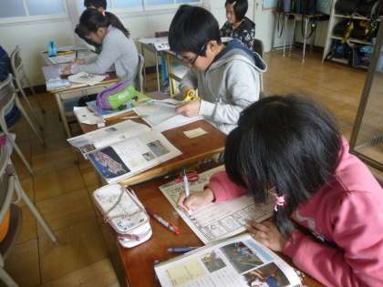 「自然環境を生かしたくらし」というところの学習を進めています。「海辺の人々のくらし」では、日間賀島をとりあげました。今日は、学習したことをもとに、新聞風にまとめを行いました。学んだことをもとにして、見やすく、きれいな作品に仕上げました。