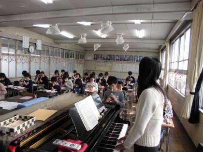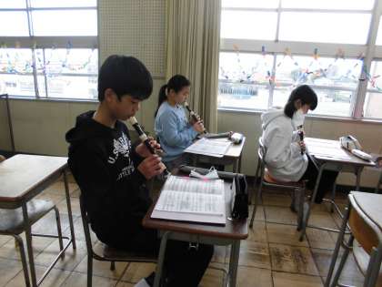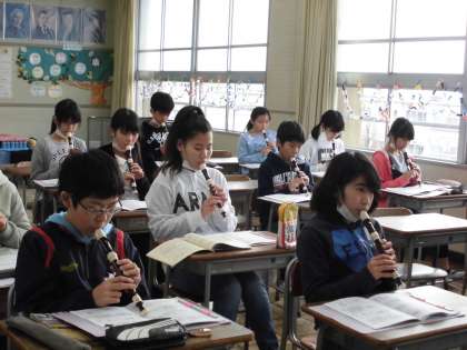 お祭りの音階の音色が音楽室で響いています。6年生の音楽の時間の様子です。ソプラノリコーダーで「八木節」の演奏をしました。リズムや指使いに慣れるよう、2小節ずつゆっくりなテンポからだんだん速くしていく学習をしました。学習のまとめの時間ではCDに合わせて、軽快に演奏することができました。