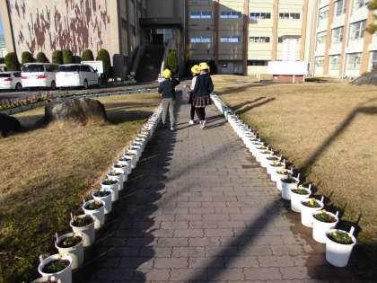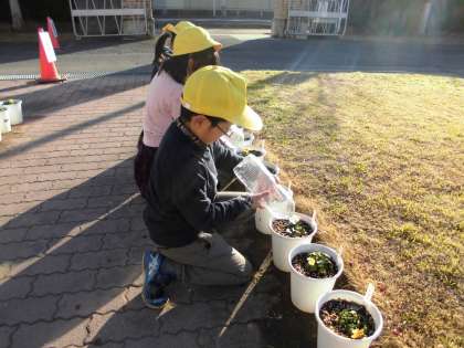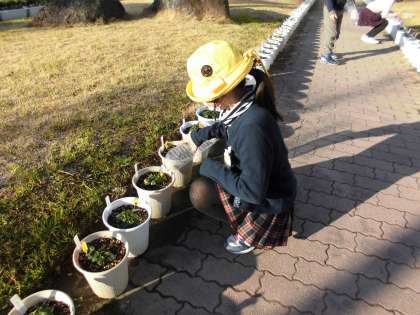 縦割り班で鉢に植えたパンジーの水やりを、毎朝欠かさず行っています。3年生の児童たちは正門に置いてあるパンジーが担当になっています。早く大きくなってね。綺麗に咲いてね。と心を込めて水をあげることができました。これからもよろしくお願いします。