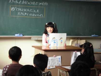 2年生の生活科の授業の様子です。今まででできるようになったことを発表しました。発表内容を画用紙にまとめ、自画像も描きました。みんなの前で大きな声で発表することができました。頑張りましたね。