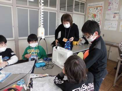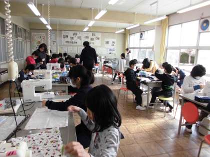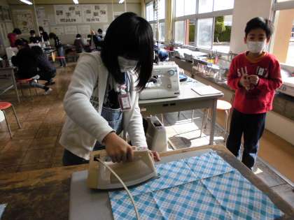 5年生家庭科の時間の様子です。ミシンの使い方にも慣れて、直線縫いもきれいにできるようになりました。アップリケもデザインして、アイロンがけをしました。いい作品になりました。