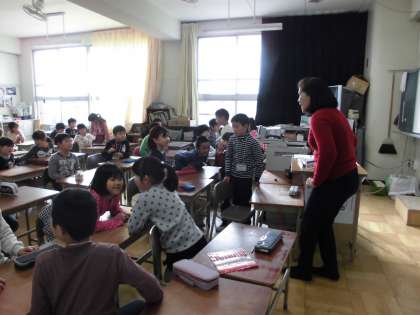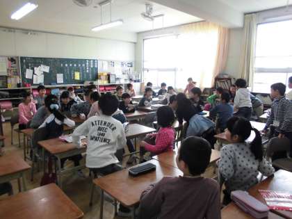 2年生の英語活動の様子です。いちばん前の席の子が運動している絵を見て、後ろの席の子に伝言していきます。最後の子が伝言された内容をジェスチャーをしながら、英語で答えるというゲームを行いました。とても楽しく授業をすることができました。
