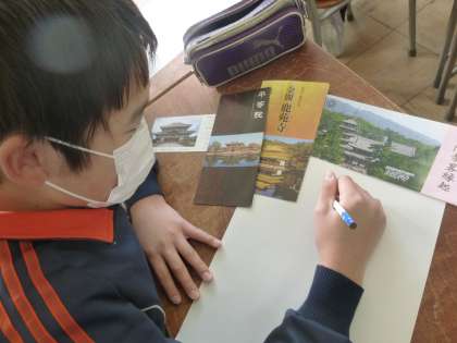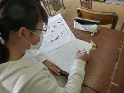 版画の制作に取り掛かっています。テーマは「小学校の思い出」です。修学旅行やキャンプなど、様々な思い出を題材として下絵に取り掛かりました。