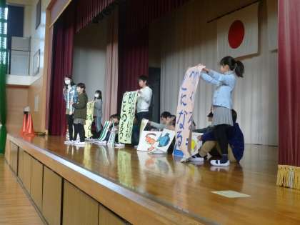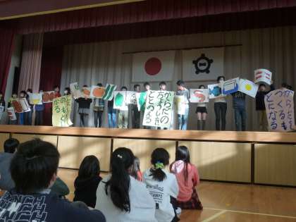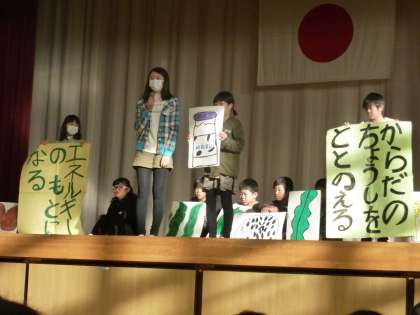 児童集会では、給食委員会からの発表を行いました。3大栄養素について説明しました。また、牛乳のはたらきなどをクイズ形式で伝えるとともに、食器返却についての給食委員会からのお願いをしました。
