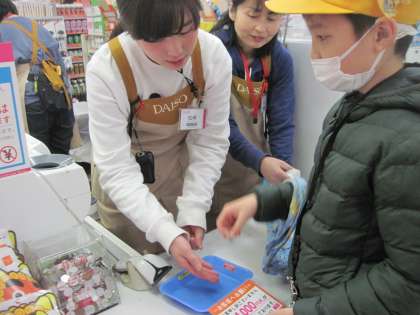 暖かい日差しの中、歩いて教育展へ行ってきました。会場のスポーツ文化センターへ行く途中、買い物の学習のため、ダイソーに寄って、おうちの人から頼まれた物を買いました。小銭で108円ぴったり払うことができました。