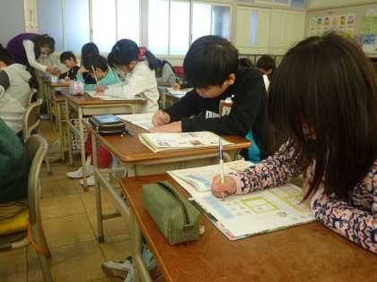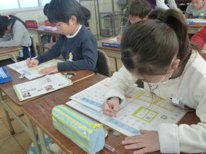 書写では、学年のまとめをしました。学習してきたことを生かして、「時間割」を書きました。漢字では、書き順、画の長さ、文字の中心など、様々なことに気をつけて書きました。