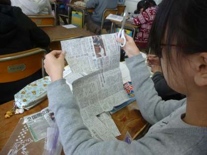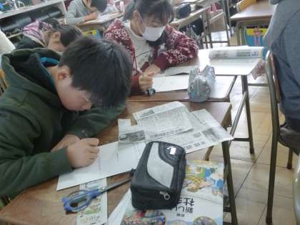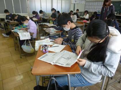 社会科の学習のまとめとして、新聞を読んで、自分の意見を書きました。一日分の新聞の中から、関心のある記事を選び、切り抜きました。新聞を読むことによって、社会へ目を向ける大切な学習となります。