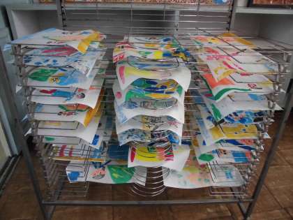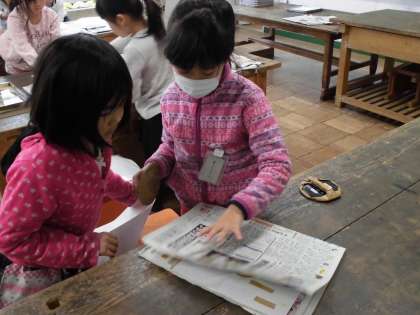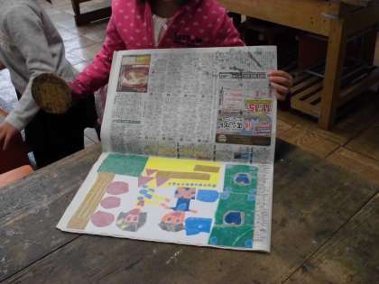 濡らした紙を版の上に載せて、新聞紙の上からバレンでこすりました。しっかりとこすることで、きれいな色が表れます。どの作品もきれいに仕上がりました。