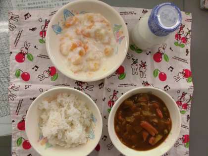 ビーフカレー フルーツのミルクゼリーよせ ご飯 牛乳