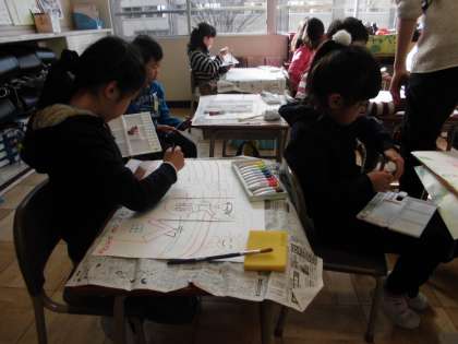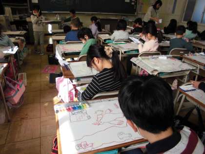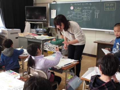 1年生の図工の時間です。乗り物に乗って、空や海や山に行って、遊んでいる情景を想像して絵を描きました。いよいよ色塗りです。細かいところも気をつけて色塗りをすることができました。