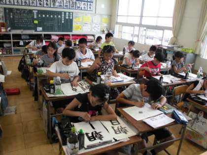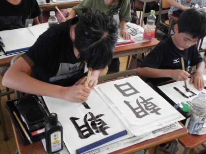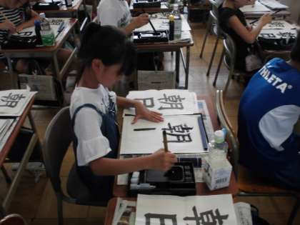 書写の時間に「朝日」という字の練習をしました。まず、手本をなぞることで、字の形やバランス、大きさなどをつかませました。それから、半紙に清書です。