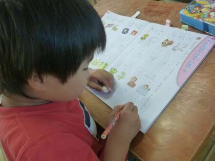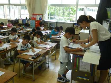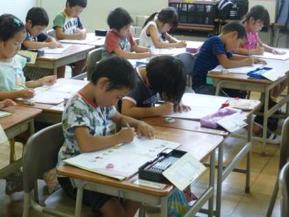かきかたの時間に「かたちのにている字」について学習を進めました。「い」と「り」、「さ」と「き」、「は」と「ほ」などです。どこが違うかよく見ながら書かせました。