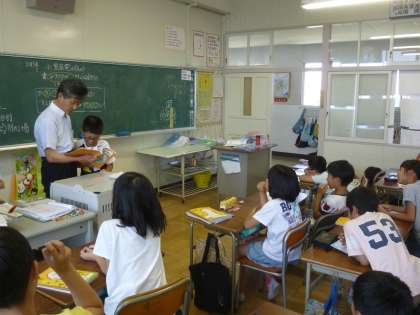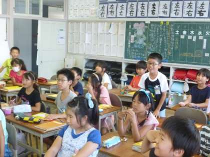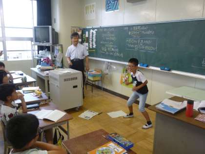1学期に学んことについて復習しました。あてられた子どもに教科書の挿絵などを見せ、黒板に絵でかかせてみんなに聞きました。何の絵をかいているのか、みんな一生懸命考えました。また、同じように教科書の挿絵をジェスチャーで表し、みんなに考えてもらいました。工夫一つで楽しい授業になるものです。