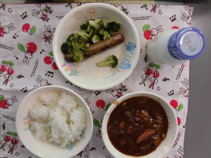 ハヤシシチュー 焼きフランクフルト ごはん 牛乳