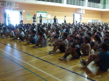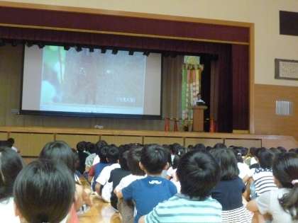 朝礼では、校長から「夏の音」と題して動画を見せながら話をしました。夏の音とは、「セミの鳴き声」で、校長自身が小学生のころのラジオ体操の朝に聞いたセミの鳴き声や夏休みの朝のにおいなどについて話しました。