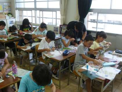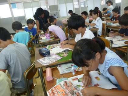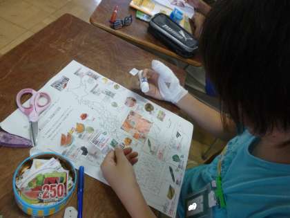 社会科では、食料の産地調べをしています。今日は、チラシに掲載されている食料がどこで作られているかを調べながら、切り抜いて白地図にはり付けていきました。最近のチラシには、産地まで書かれているものが多く、子どもたちには、消費者がそういうことを気にしていることを理解させました。