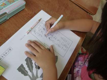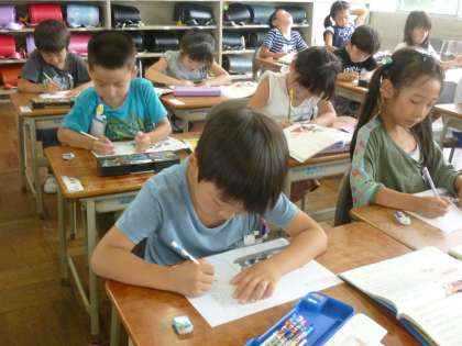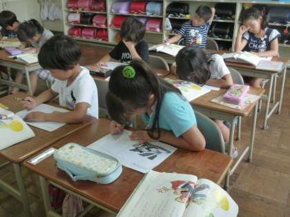 「おおきなかぶ」の学習を進めています。場面の様子を読みとる学習ですが、本文には、会話文などがなく、登場人物の心情にあまりふれられていません。そこで、場面ごとに、登場人物の気持ちを会話文として書かせています。気持ちを想像させるとともに言葉にして書かせるという学習です。子どもたちの言語感覚を飛躍的に向上させる授業です。