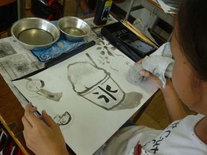 図工の時間に墨で絵をかきました。水墨画風に書こうとしましたが、水の混ぜ方が難しく、様々な工夫を試みていました。テーマは「夏」で、いろいろな夏の風物詩を取り上げ、素敵な墨絵ができました。