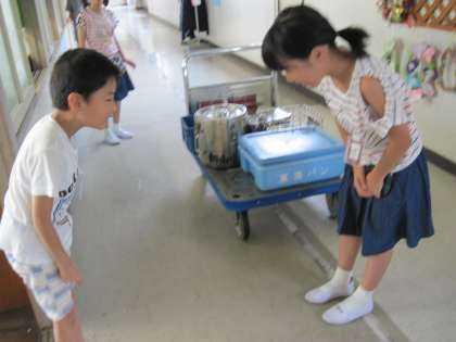 1学期最後の給食です。給食当番の仕事も手際よくできるようになりました。みんなで食べるとおいしいです。いつも片づけを手伝ってくれる委員会の人にきちんと挨拶をしました。