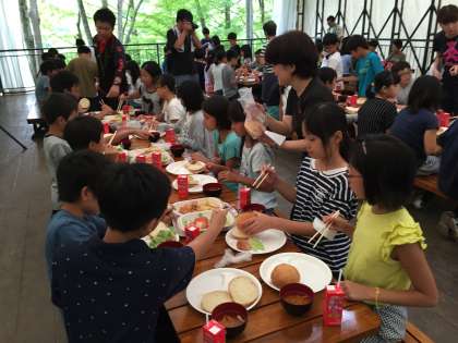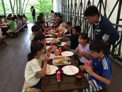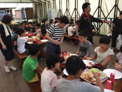 朝食の時間です。チキンハンバーグ、フライドポテト、スープ、ジュースです。