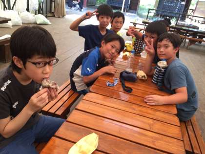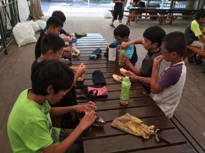 自分でさばいたアマゴ、塩焼きにしてもらいました。香ばしく、「おいしい、おいしい」との声が聞こえました。
