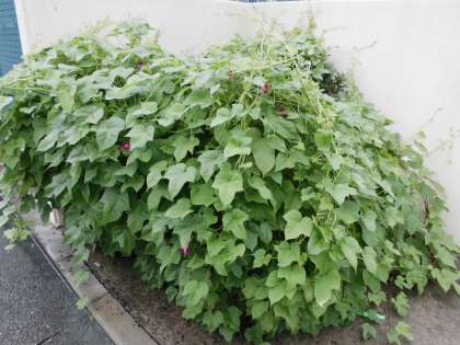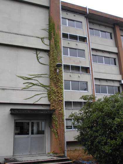 南門の朝顔はとても元気です。茎や葉が絡み合って大きく成長をしています。そして、隠れるように赤い花が数輪。気づかないうちにひっそりと咲いていたようです。北舎の北側に絡みついている蔦。まるで一本の木のようです。